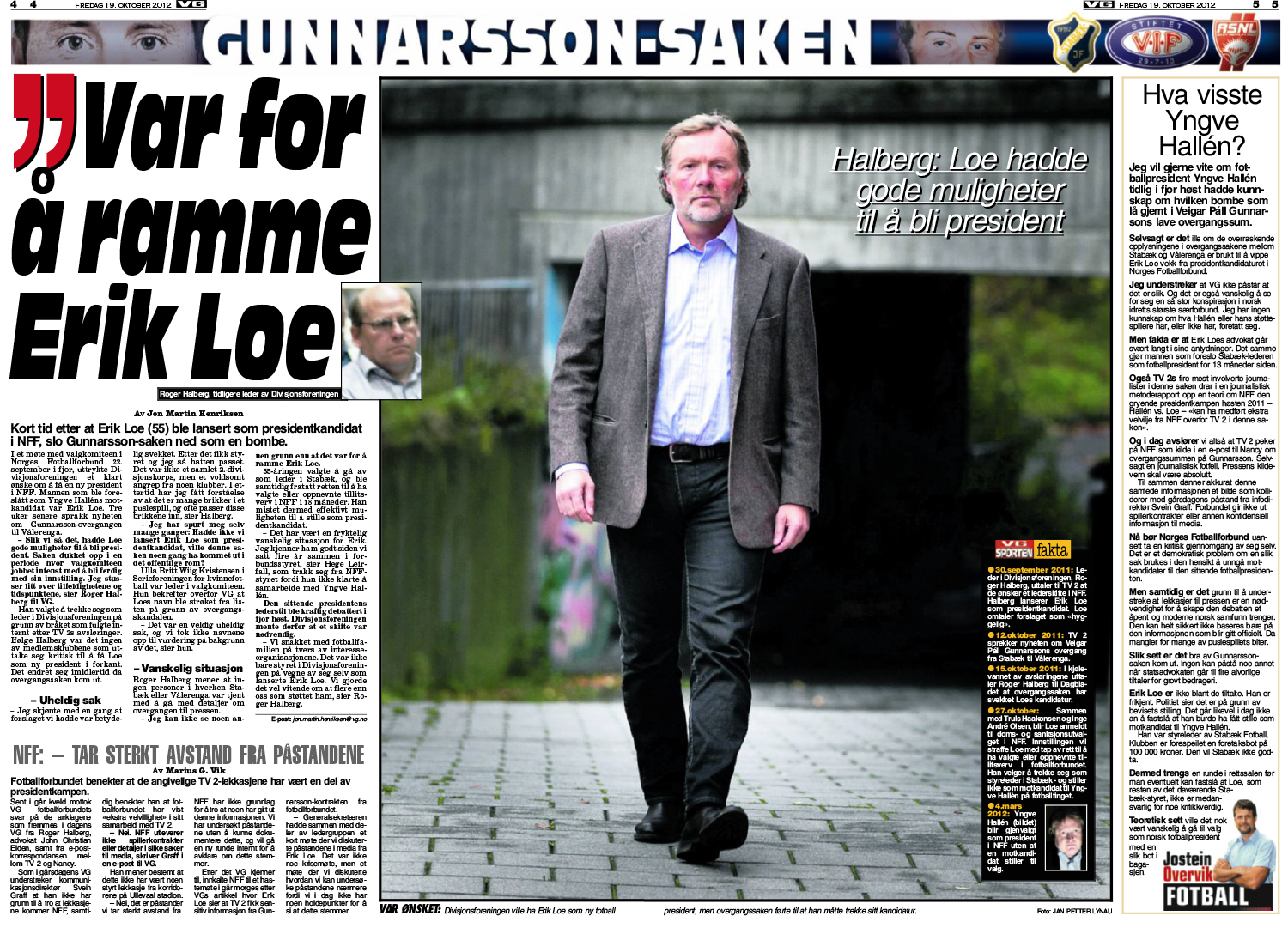 «Kort tid etter at Erik Loe (55) ble lansert som presidentkandidat i NFF, slo Gunnarsson-saken ned som en bombe», skrev avisen i ingressen.
