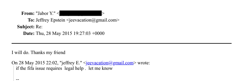 I 2017 var de også i kontakt da Epstein sendte «Jabor Y» (oppslagsbilde) en epost med en lenke til en Reuters-artikkel der Qatar avviste korrupsjon i forbindelse med tildelingen av VM til Qatar.