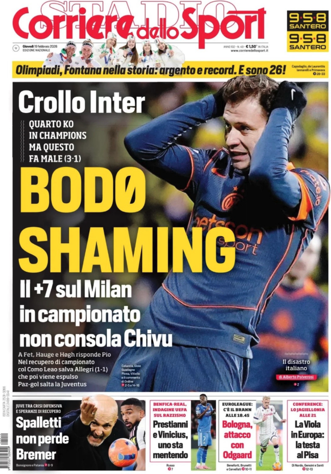 Rivalen Corriere dello Sport kjørte ordspill på «body shaming» på forsiden og mente at Inters sjupoengsforsprang ned til rivalen Milan på andreplass på Serie A-tabellen ikke var noen trøst for Inter-trener Christian Chivu etter at de ble gjort til skamme i Bodø.