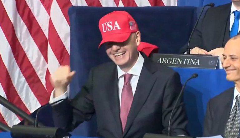 I går var det innvielsesseremnoni i Donald Trumps «fredsråd». Som vanlig var ikke Fifa-president Gianni Infantino langt unna Trump-begivenhetenes sentrum. Med rød cap med bokstavene «USA» satt han foran Ungarns statsminister Viktor Órban og Argentinas president Javier Milei. Fifa skal spytte inn 75 millioner dollar i «fredsrådet i det Trump «tror er fotballrelaterte» prosjekter i Gaza.