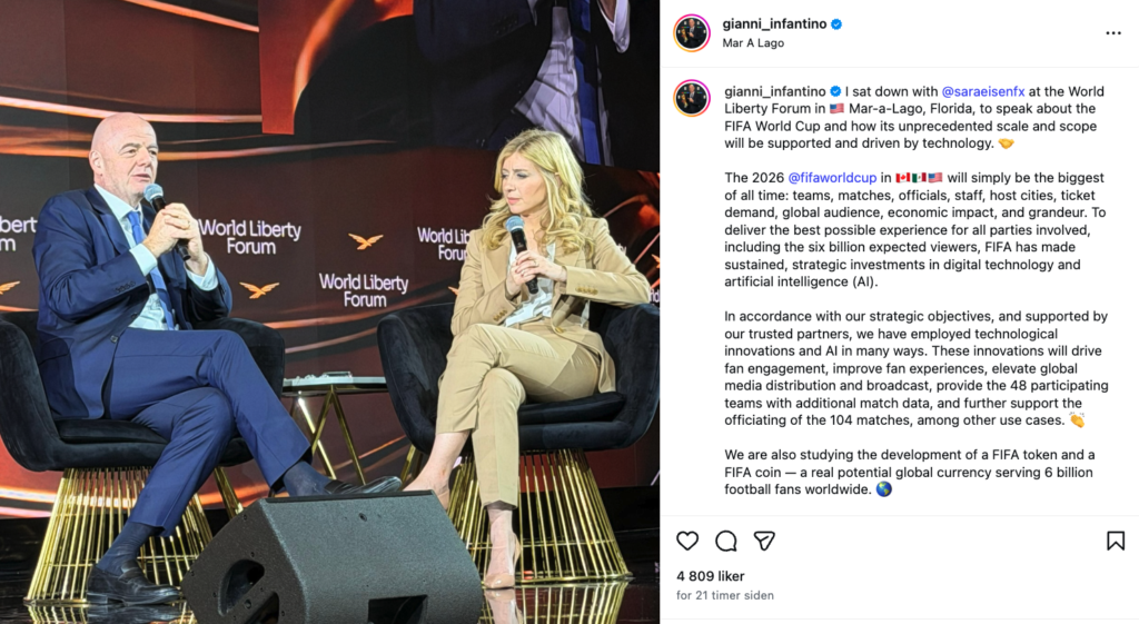 Han har også – som vanlig – vært i USA. Og ikke hvor som helst, heller. Først var han på Trumps resort Mar-a-Lago i Florida under World Liberty Forum. Arrangementet er Trump-familiens feiring av kryptovaluta. Der hører selvsagt fotballens president hjemme. Før han reiste til Washington DC for å være med under «fredsrådet» .