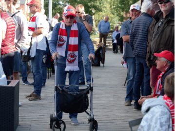 Tilbake ved elvepromenaden myldrar det no av folk, alle unntatt ekstremt få festpryda i raudt og kvitt. Vi følgjer straumen over brua til Kråkerøy-sida og stikk innom Båthuset, som, slik namnet jo sterkt antydar, er eit gamalt båthus, no forvandla til ein stad kor ein kan nyte kjølige forfriskningar medan ein ser og vert sett. I folkemengda støyter vi på Bjørn Johannessen. Han er 79 år (ja, vi spør om alderen, sjølv om det er uhøfleg) og avhengig av rullator for å kome seg omkring, men har vore fast inventar på Fredrikstad stadion (gamal og ny) sidan 1955(!), har òg bak seg ein periode som dagleg leiar i klubben, og er framleis til stades på dei aller fleste heimekampane. Det er ikkje fritt for at eg kjenner ein viss historisk ærefrykt i møte med ein slik veteran. Bjørn har vore augevitne til at Bjørn Borgen, «Snæbbus» Kristoffersen og Roar Johansen slo gjennom i norsk toppfotball! Han har følgt alle klubbens opp- og nedturar dei siste seksti åra, og entusiasmen er stadig like sterk. Han går generøst med på å verte fotografert, samstundes som han med fast røyst kunngjer at FFK «heilt garantert» kjem til å vinne dagens kamp: «3-0! Minst!», fastslår han før han bevegar seg vidare i retning stadion. Straks etterpå møter vi ein heldig kar som er innehavar av eit verkeleg klenodium, nemleg ein praktfull skinn-cap med fotballmønster, signert av samtlege spelarar frå det triumferande cupfinalelaget anno 1984. Her er namnetrekka til målkongen Jørn Andersen, kanonskyttaren Per Egil Ahlsen, son av sin far, «Snæbbus», Atle Kristoffersen, og mange fleire. Han fortel at han vanlegvis ikkje brukar å ha på seg capsen på kamp, men akkurat i dag syntest han det passa seg. På spørsmål om han kunne tenkt seg å selje klenodiet, svarer han sjølvsagt eit klokkeklart nei, men legg til at han kunne vurdert å gjere det viss det var til inntekt for ei god sak, for eksempel kreftsaka. I så tilfelle ville det garantert ikkje mangle potensielle kjøparar, for eigaren meiner capsen er den einaste i sitt slag! (Amatørmessig nok gløymer vi å notere namnet til denne mannen i alt mylderet, så viss du les dette, cupfinalecapsens eigar, er det berre å beklage på det sterkaste!)