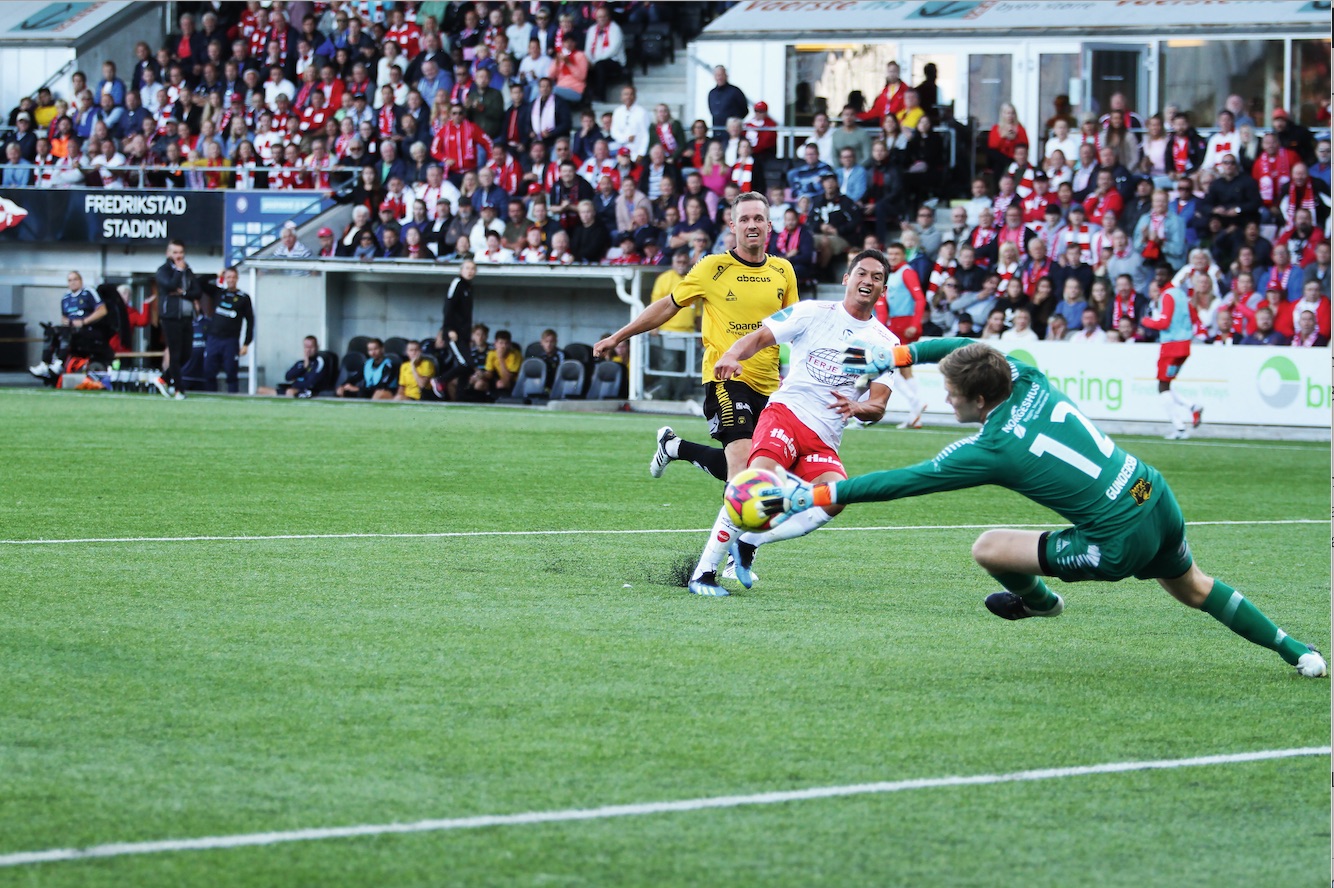 Det er på tide å kome seg på kamp. På vegen møter vi ein liten skare unge menn som freistar å introdusere moderne supporterkultur, i form av pyroeffektar, for fotballtradisjonsbyen Fredrikstad. Ekko av høglytte smell gjallar frå dei gamle verkstadhallane som utgjer Fredrikstad stadions eksteriør, medan tung, grå røyk breiar seg over pølsebodane, kor byens pølseseljarar har årets i særklasse travlaste dag. Vi finn akkrediteringskontoret kor vi vert akkreditert – Gulliksen får ein gild, gul vest og løyve til å opphalde seg på indre bane, bak måla, medan eg vandrar opp stadions bratte trapper mot sjølvaste pressetribunen! Ein halvtime før kampstart er tribunane i ferd med å fyllast opp. Det er eit betagande syn. For uansett kva ein måtte meine om prosessen kring stadionbyggjinga, kan ein ikkje nekte for at stadion i seg sjølv er eit svært vellukka anlegg, både estetisk og praktisk vurdert. Og viss du ikkje vil ta mitt ord for dette, kan du ta ordet til bror min, Even, Josimar-skribent, stadion-ekspert og førsteamanuensis ved Arkitektur- og designhøgskolen i Oslo, som meiner at Nye Fredrikstad stadion er flottast av alle nye anlegg i norsk fotball. I dette ligg, trass alt, ein potensielt stor styrke for FFK, for ein skal ikkje undervurdere effekten av eit slikt staseleg arbeidslokale, når det gjeld å trekkje til seg spelarar av god kvalitet i konkurranse med andre klubbar. Samstundes kan eg ikkje fri meg frå å tenkje at det er mange grå kvardagar i PostNord-ligaen, dagar då sola ikkje skin og det ikkje vert sett publikumsrekord, og at stadion må fortone seg ganske annleis når dei fleste av dei 12 500 publikumsplassane står tome.