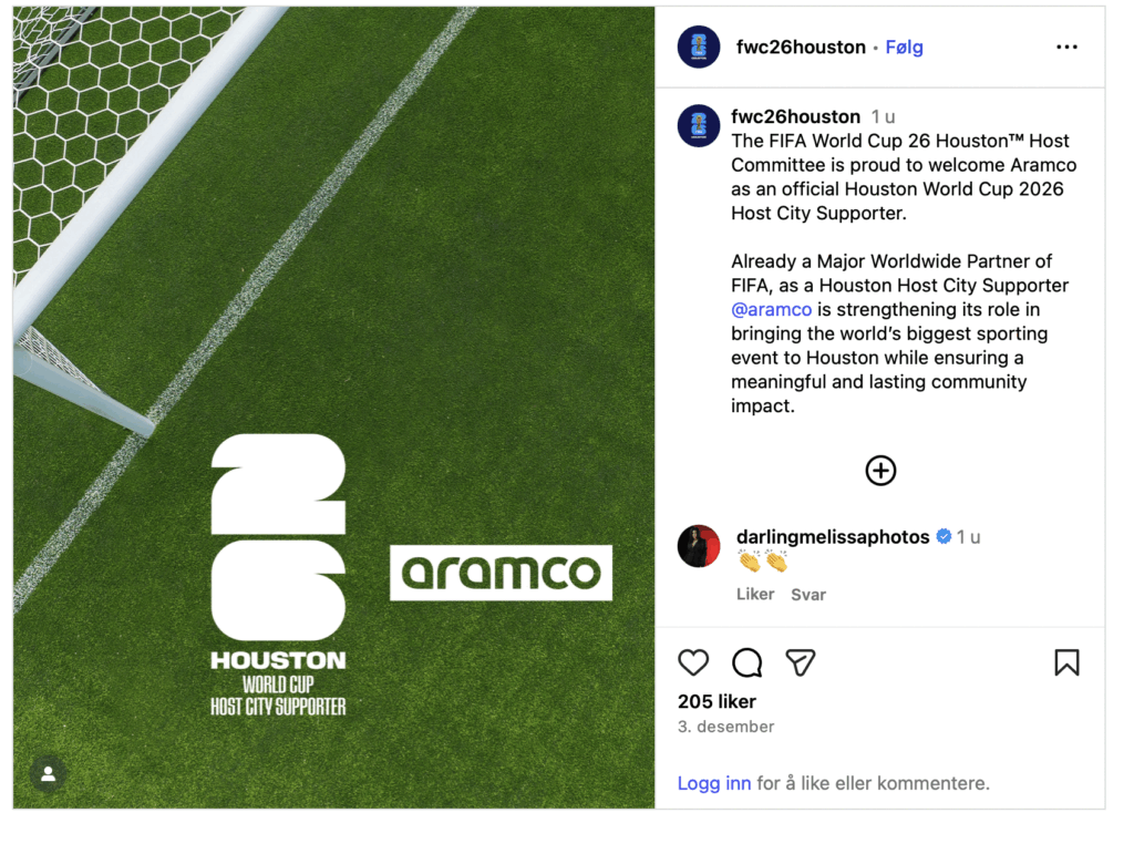 Like før trekningen til VM 2026 inngikk Houston, en av elleve amerikanske vertsbyer , en sponsoravtale med det saudiarabiske statlige oljeselskapet. Avtalen skal være verdt flere millioner dollar.